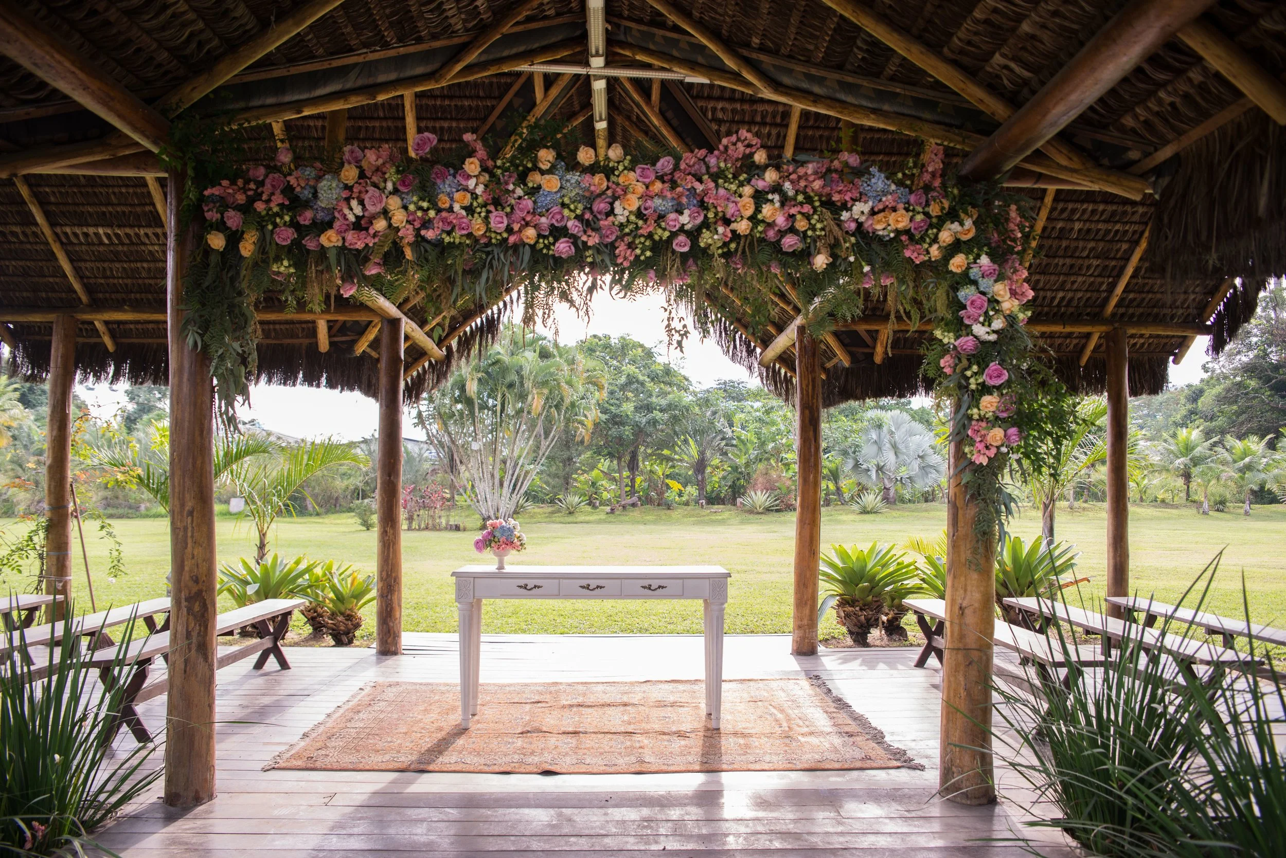 Para o sofá redondo uma arvore de boungainville no centro. Detalhe das almofadas com a estampa que criamos especialmente para esse casamento.
