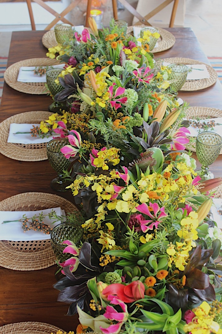 Um amor de lounge para relaxar. Reparem que todo estofado foi feito em tecido com a estampa que criamos para esse casamento. Belos arranjos florais completam o visual. Para mesa de centro um jardim poderoso com orquídeas e suculentas.