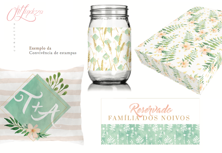 Mas como colocar todos esses elementos juntos? A gente sabe direitinho. Criamos uma identidade visual linda, única e cheia de boa energia. A estampa principal ficou linda, delicada e preciosa. As estampas secundárias complementaram nossas composições. E todos esses elementos estavam presentes no casamento.