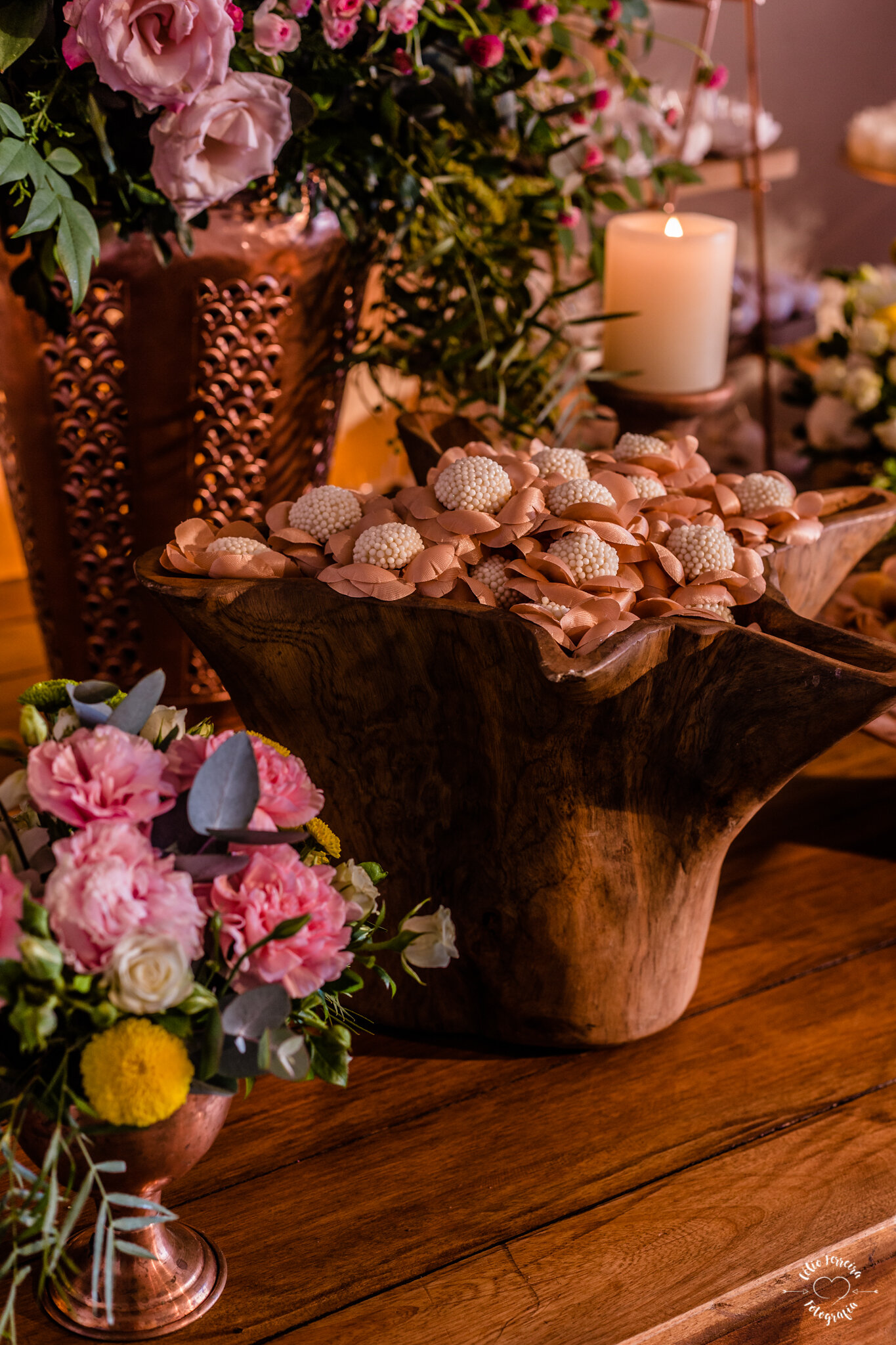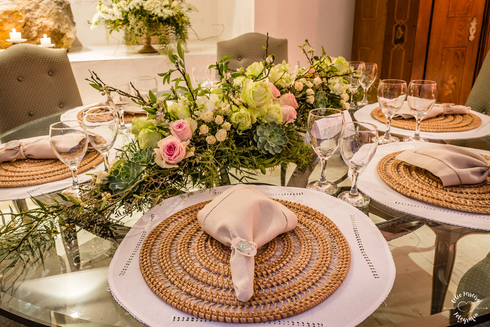 Para as mesas postas pratos nas cores da identidade visual com sousplats de rendas e taças de cristais. Para os arranjos florais desconstruídos flores nobres como as rosas, dálias e tulipas trouxeram toda atmosfera romântica que queríamos e do jeitinho que a noiva sonhou. Móveis de madeira tratada com cadeiras clássicas com palhina. Muita lindeza, amor e leveza <3