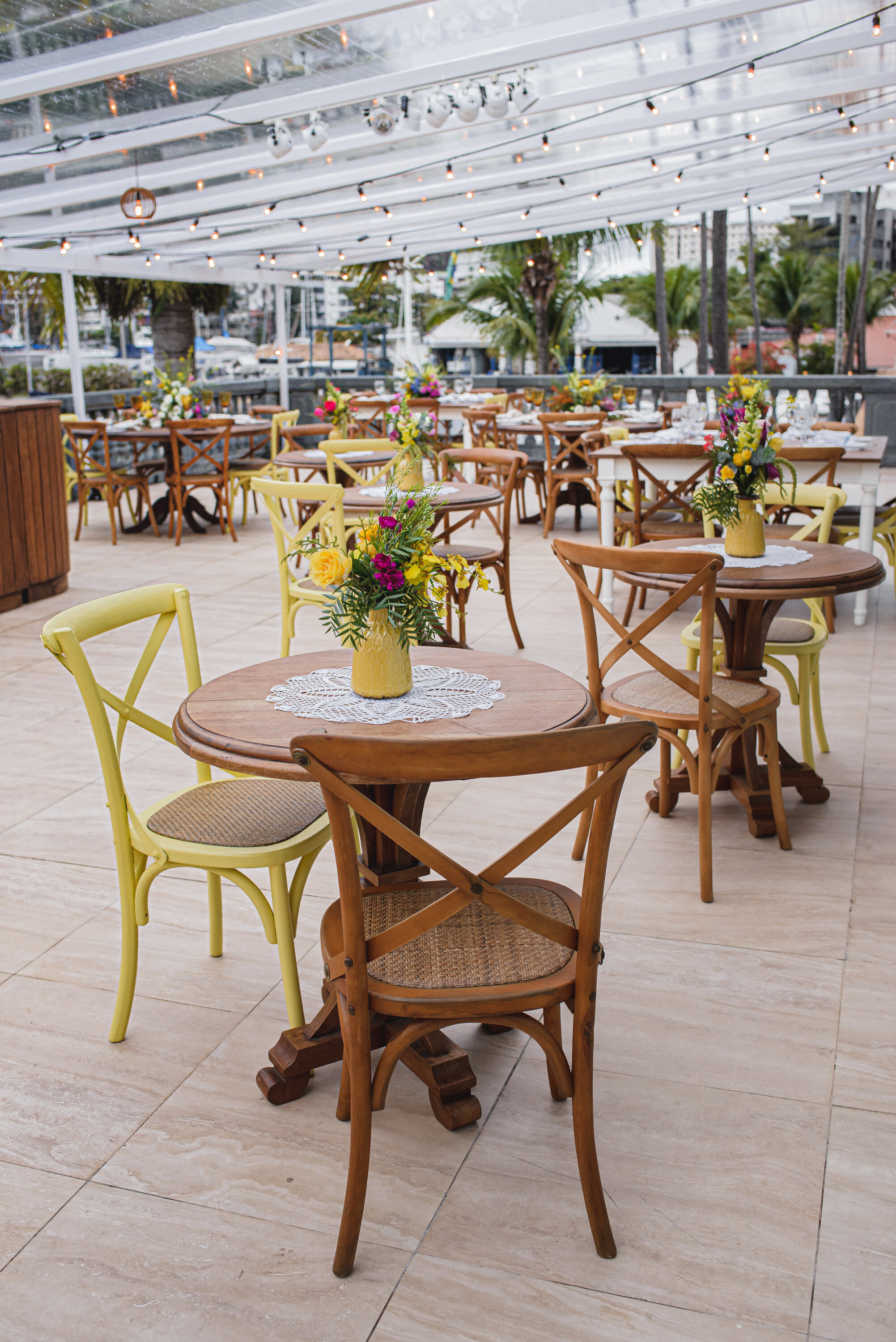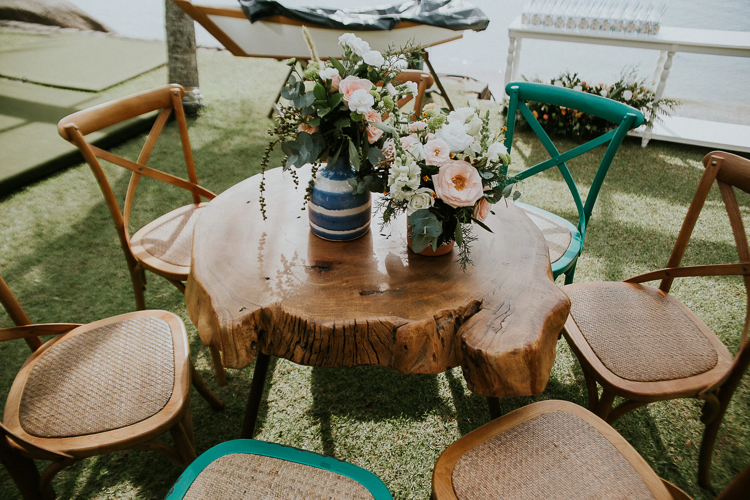 Distribuímos alguns bistrôzinhos baixos pela área dos convidados. Usando um mix de cores e de estilos de materiais como madeira, palha e ferro. Mix também de cores. Ficou uma graça.