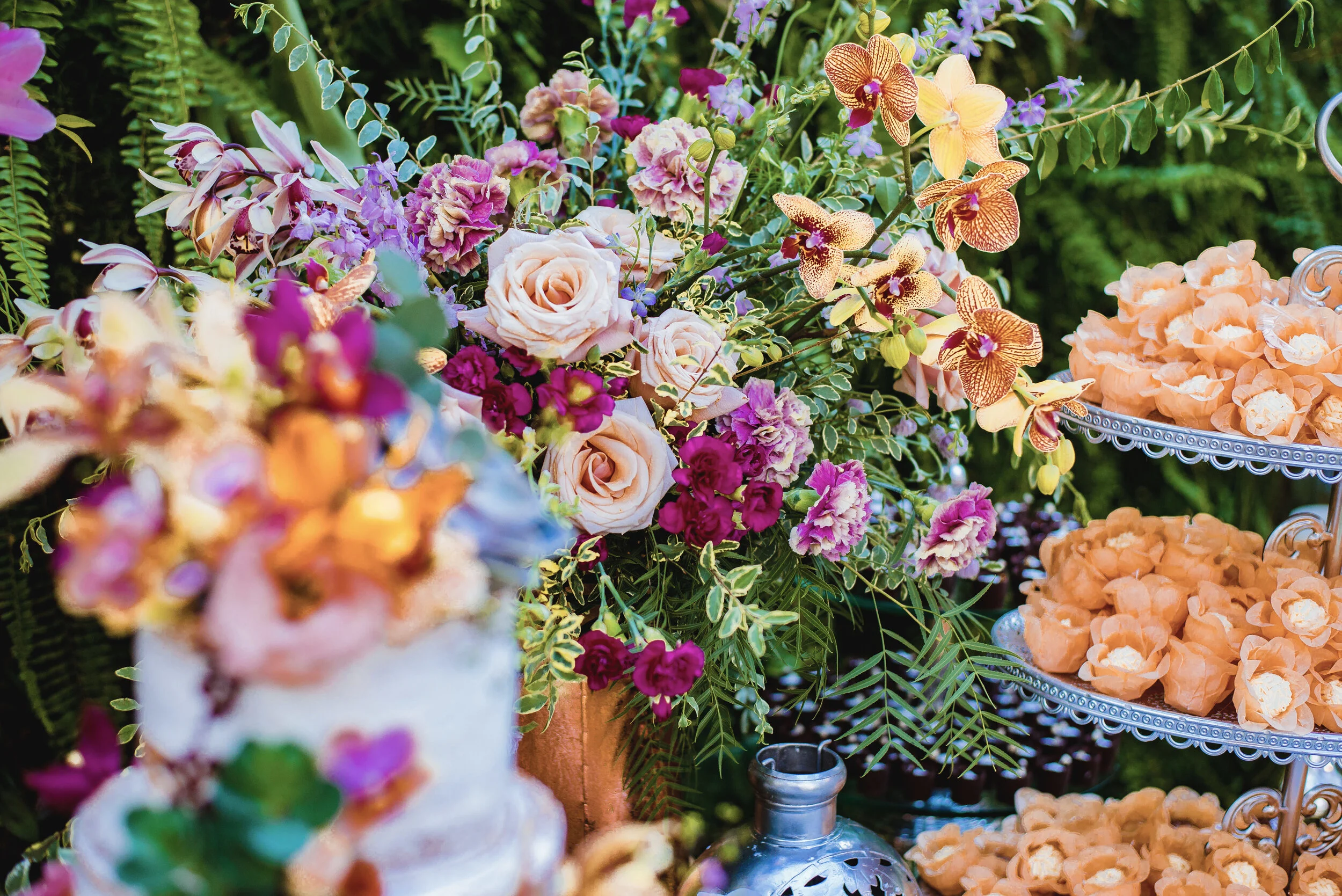 Para a mesa de doces um jardim maravilhoso em todos os cantos que se olhava. Foram muitos arranjos florais nessa belíssima composição. No alto as mandalas produzidas iguaizinhas as da identidade visual. Um bolo escândalo e muitoooooos doces pra fechar com chave de ouro. Era pura beleza para onde quer que o olhar do convidado fosse.